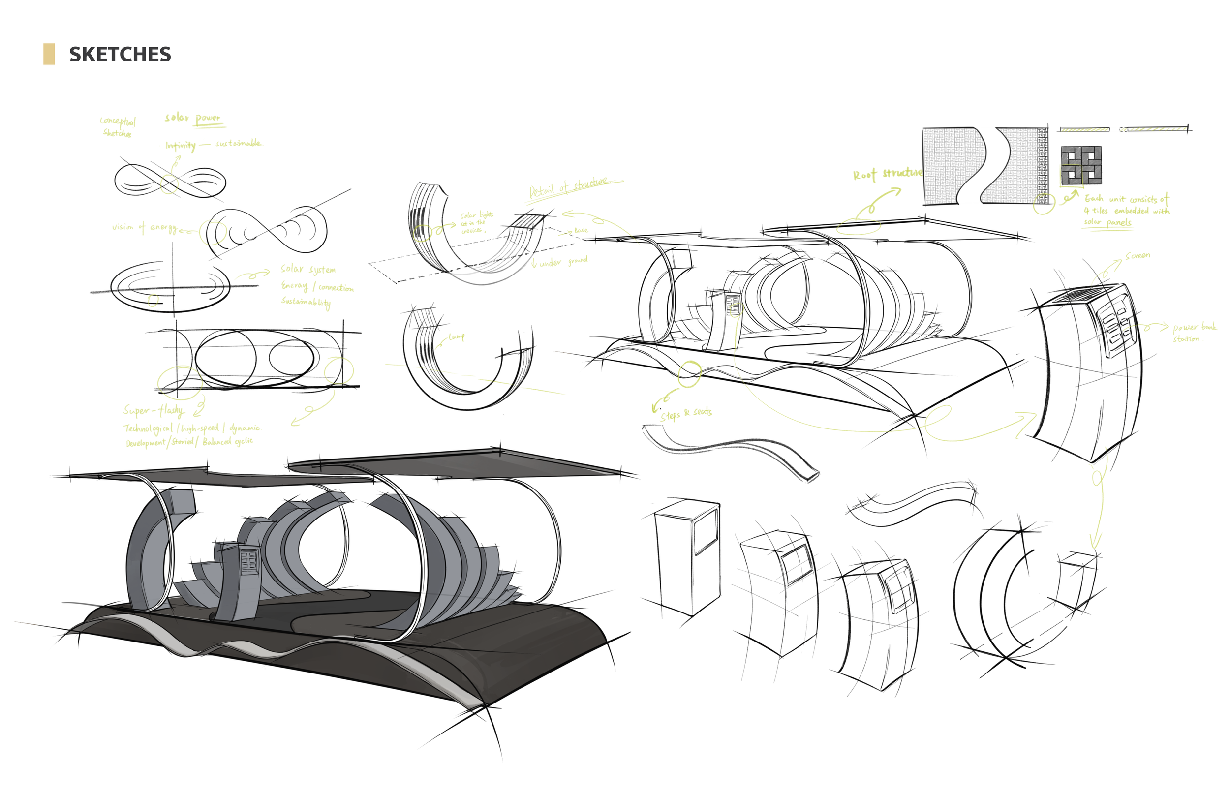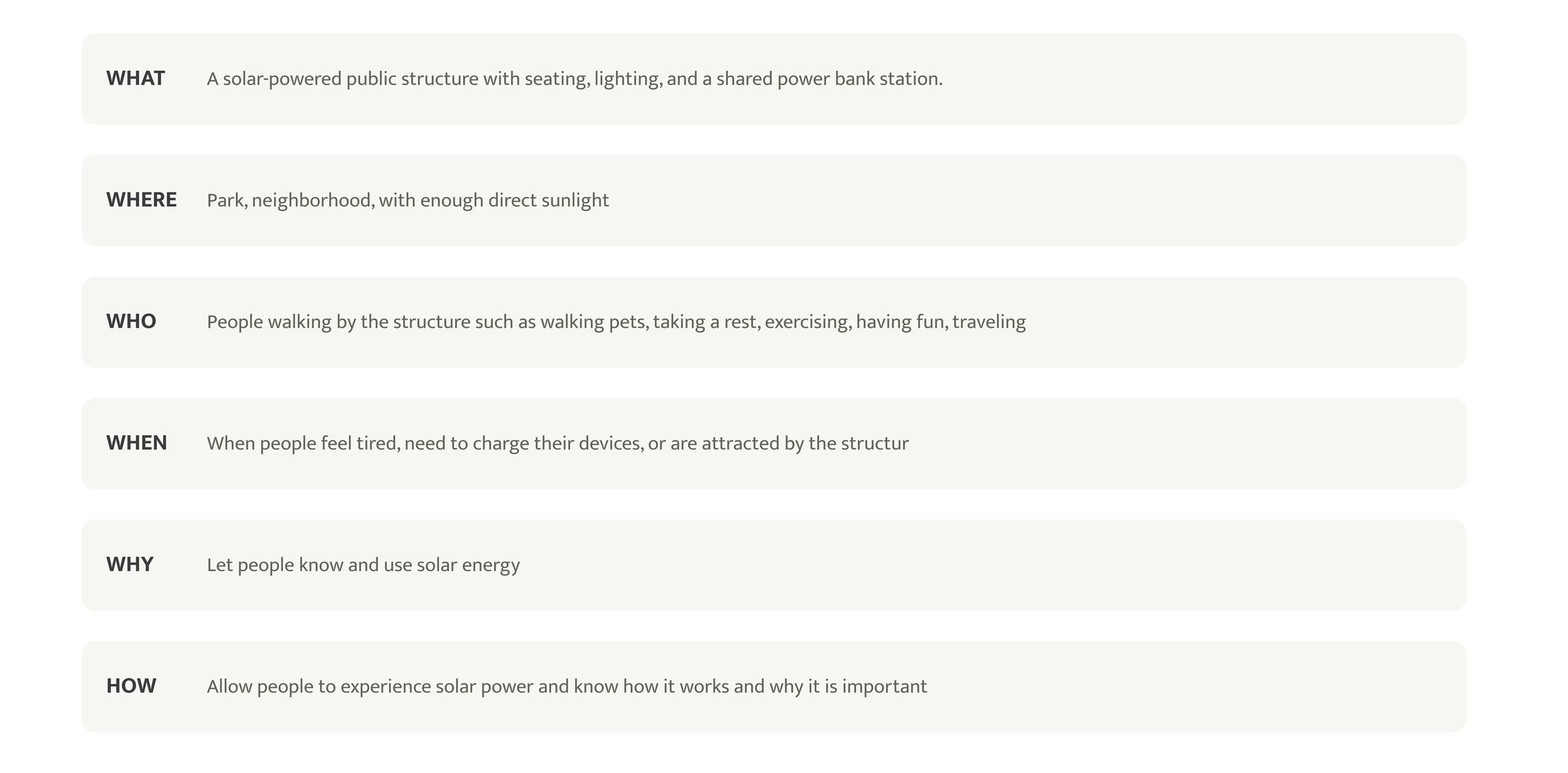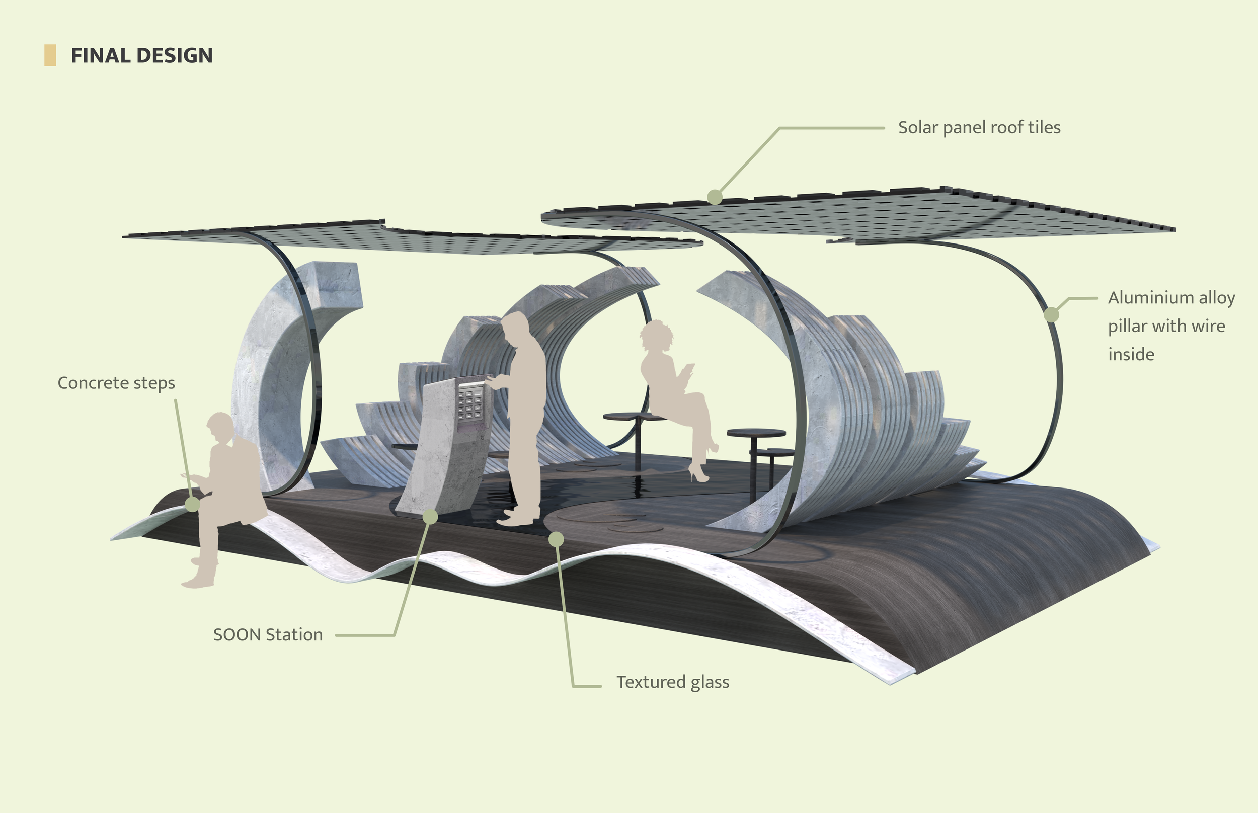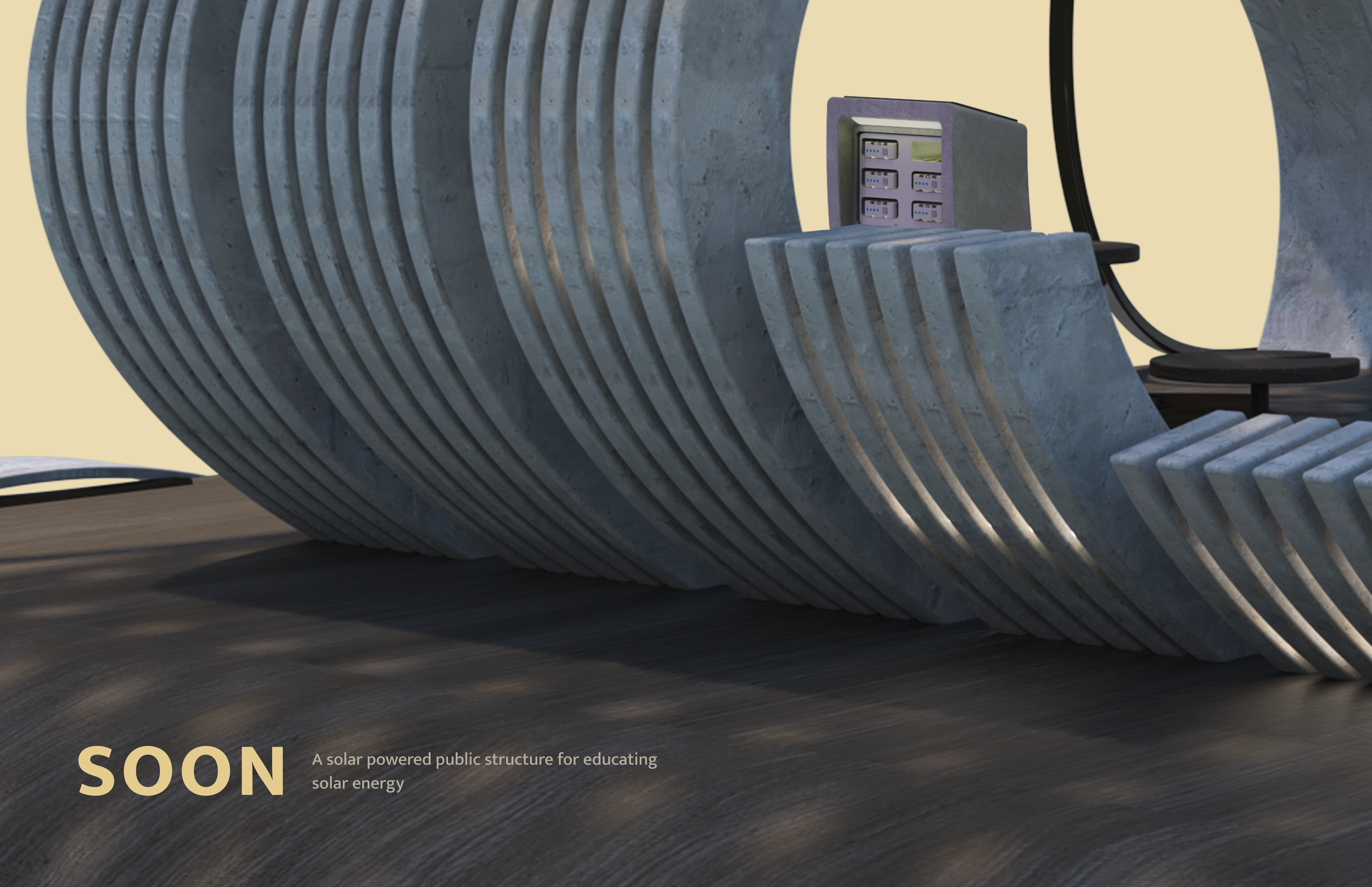 SOON A solar powered public structure for educating solar energy Project Background Solution Research - electricity generation Research -Solar energy Research - How to let people know and use User observation 5W + H summary Mood board CMF Design process Takeaways